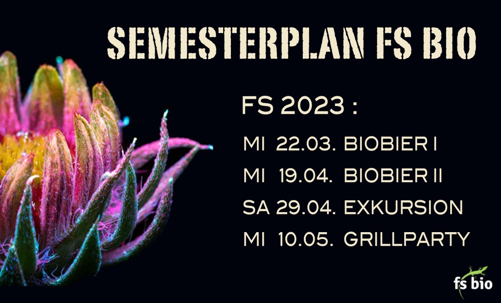 Hier ist unser Semesterprogramm für das Frühlingssemester 2023. Darauf findest du die Daten für unsere Biobierversitäten, Exkursion und Grillparty. Dieses Semester haben wir einen tollen Ausflug ins Sauriermuseum Aathal geplant! Weitere Infos und die Anmeldung werden bald auf der Webseite hochgeladen.