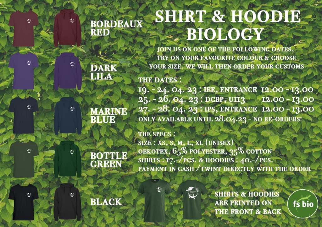 For the third time in the history of the Fachschaft you get the opportunity to try on and pre-order our cozy BIOLOGY hoodies and shirts.