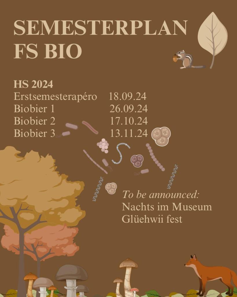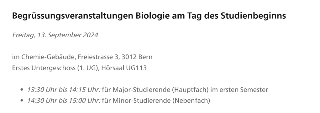 Herzlich Willkommen im Biologiestudium an der Universität Bern! Wir hoffen, dass es euch gefallen wird und ihr euch gut ins Studentenleben einlebt. Am Tag des Studienbeginns, Freitag 13. September 2024 wird euch Natalie Baumann eine offizielle Einführung ins Studium geben und anschliessend gibt es von der Fachschaft Biologie eine kurze Campustour für Interessierte, wo ihr auch schon gerne Fragen stellen könnt.